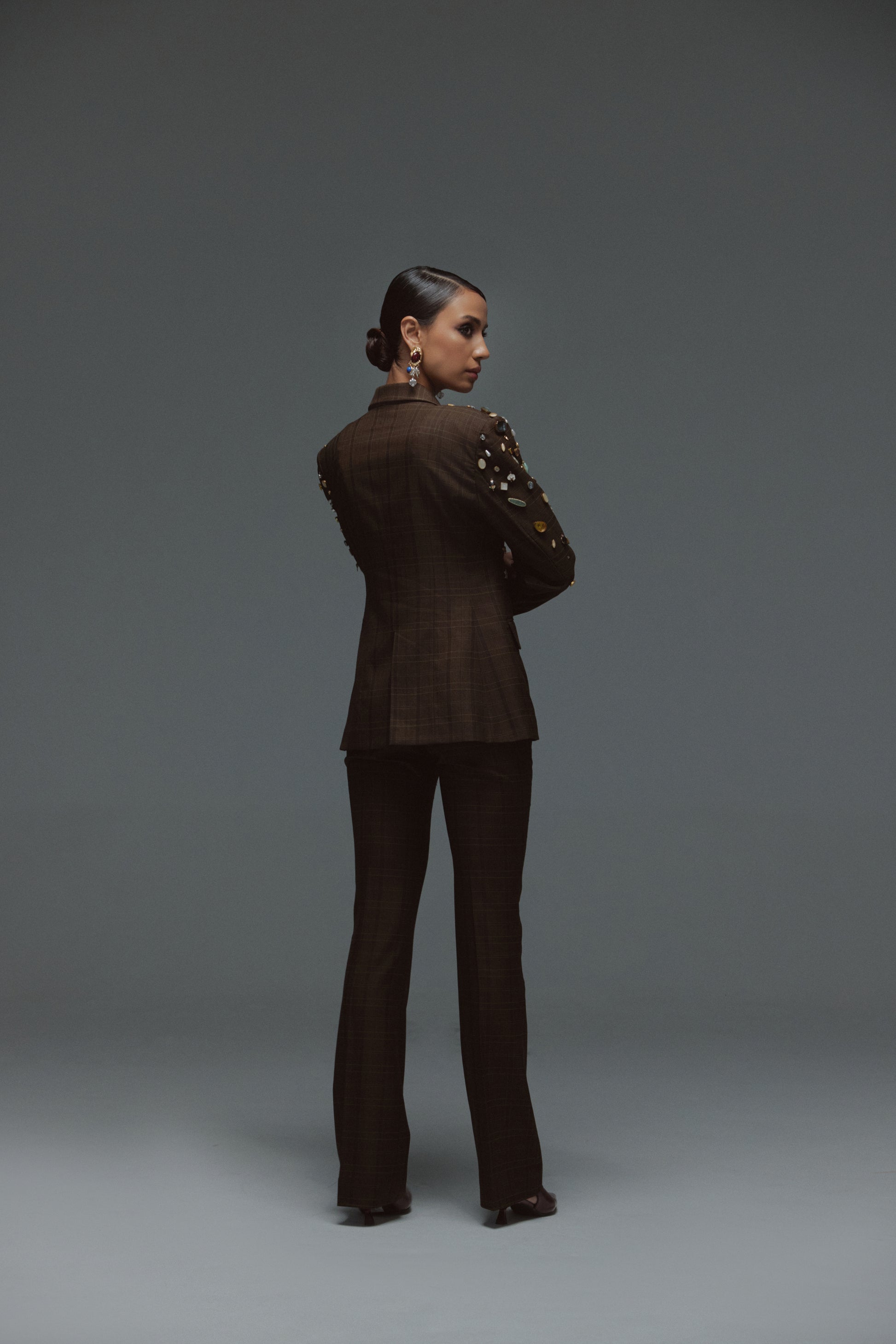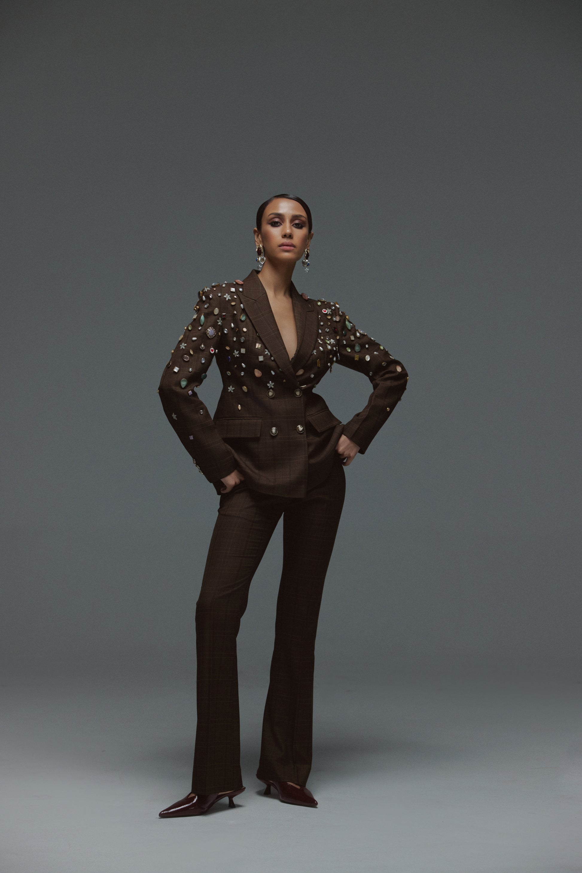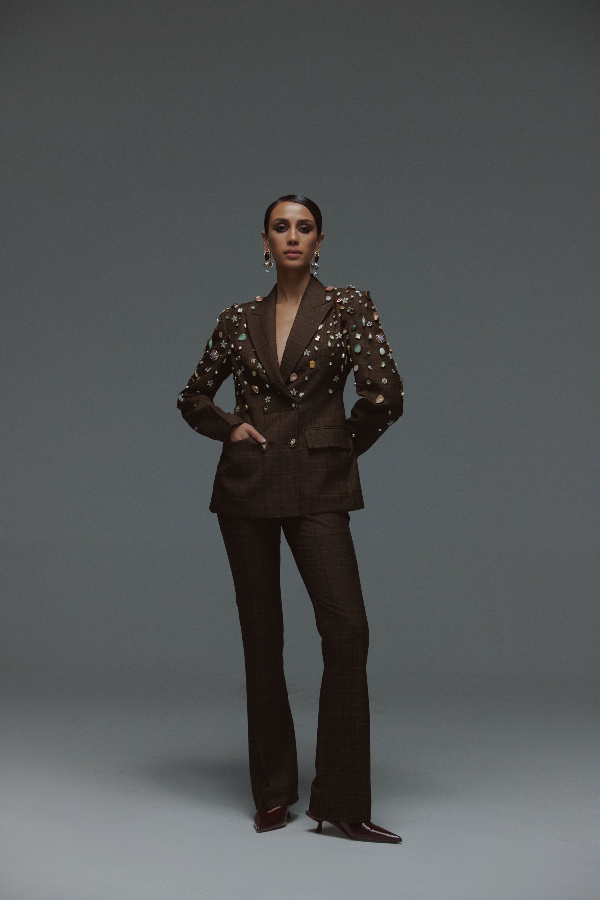 A bold reimagining of classic tailoring the Night at the Cinema set merges structured elegance with avant-garde embellishment. It includes a sharply tailored, double-breasted coat crafted from luxurious Cavani wool-blend plaid, featuring peak lapels, structured shoulders along with a complementing tailored fit and flare trousers ensuring both comfort and power dressing in one.