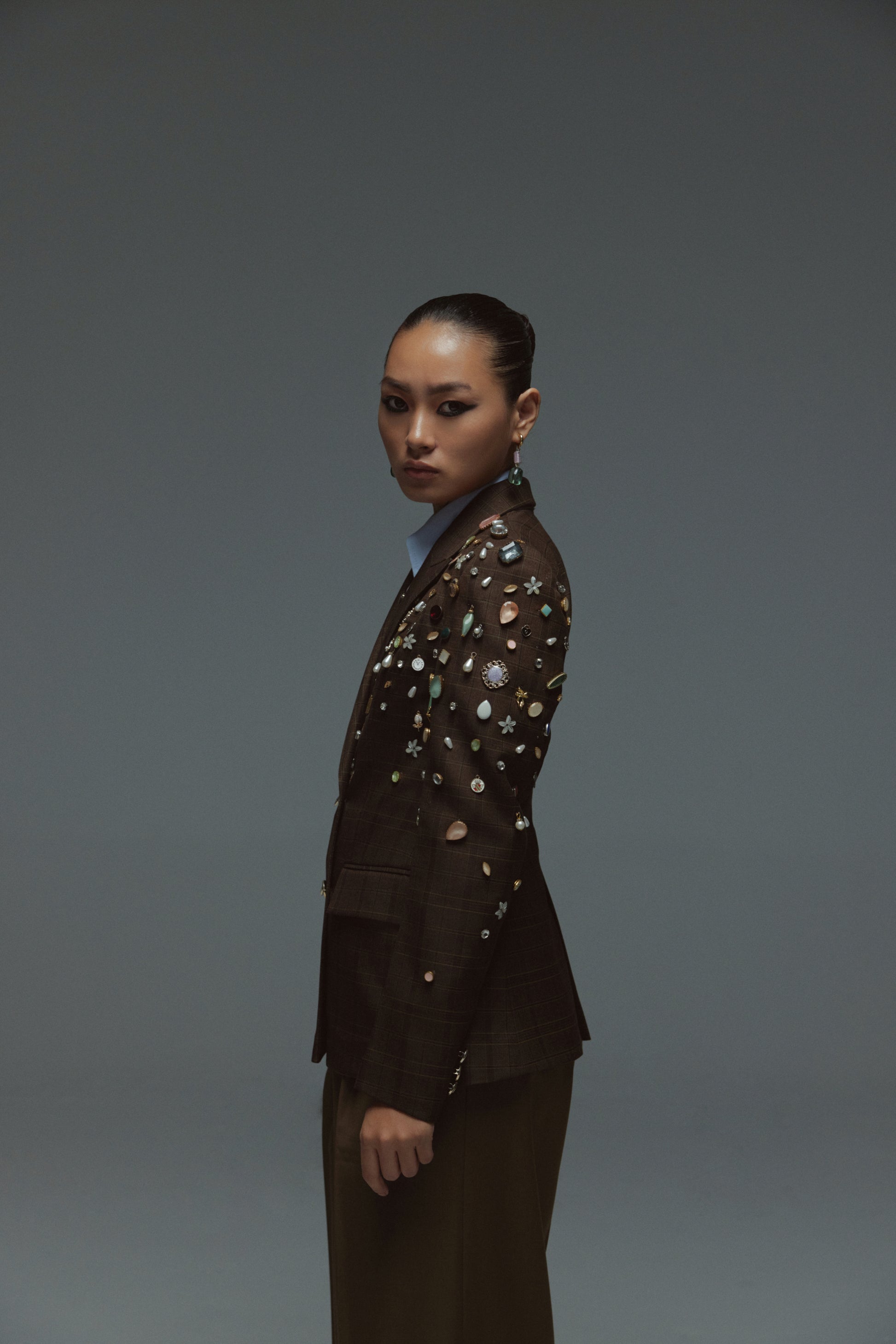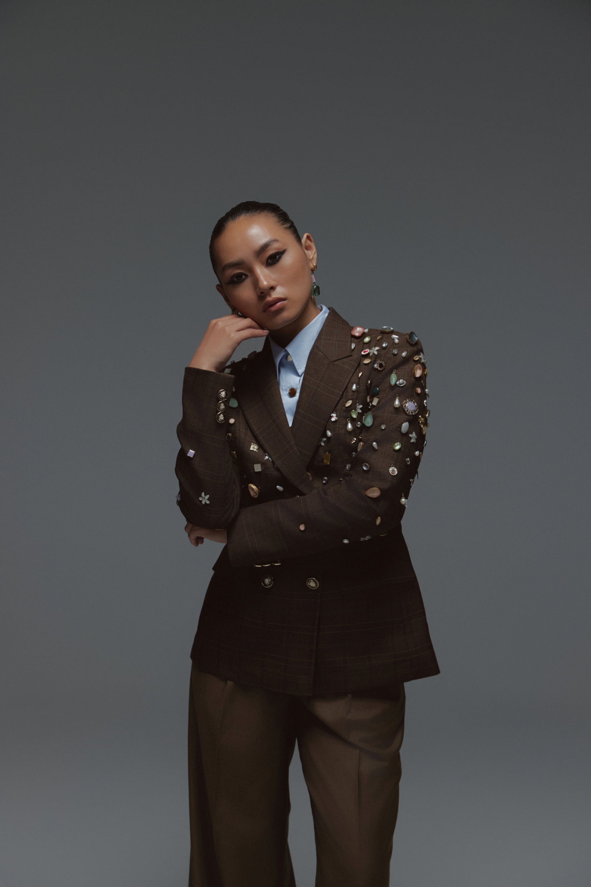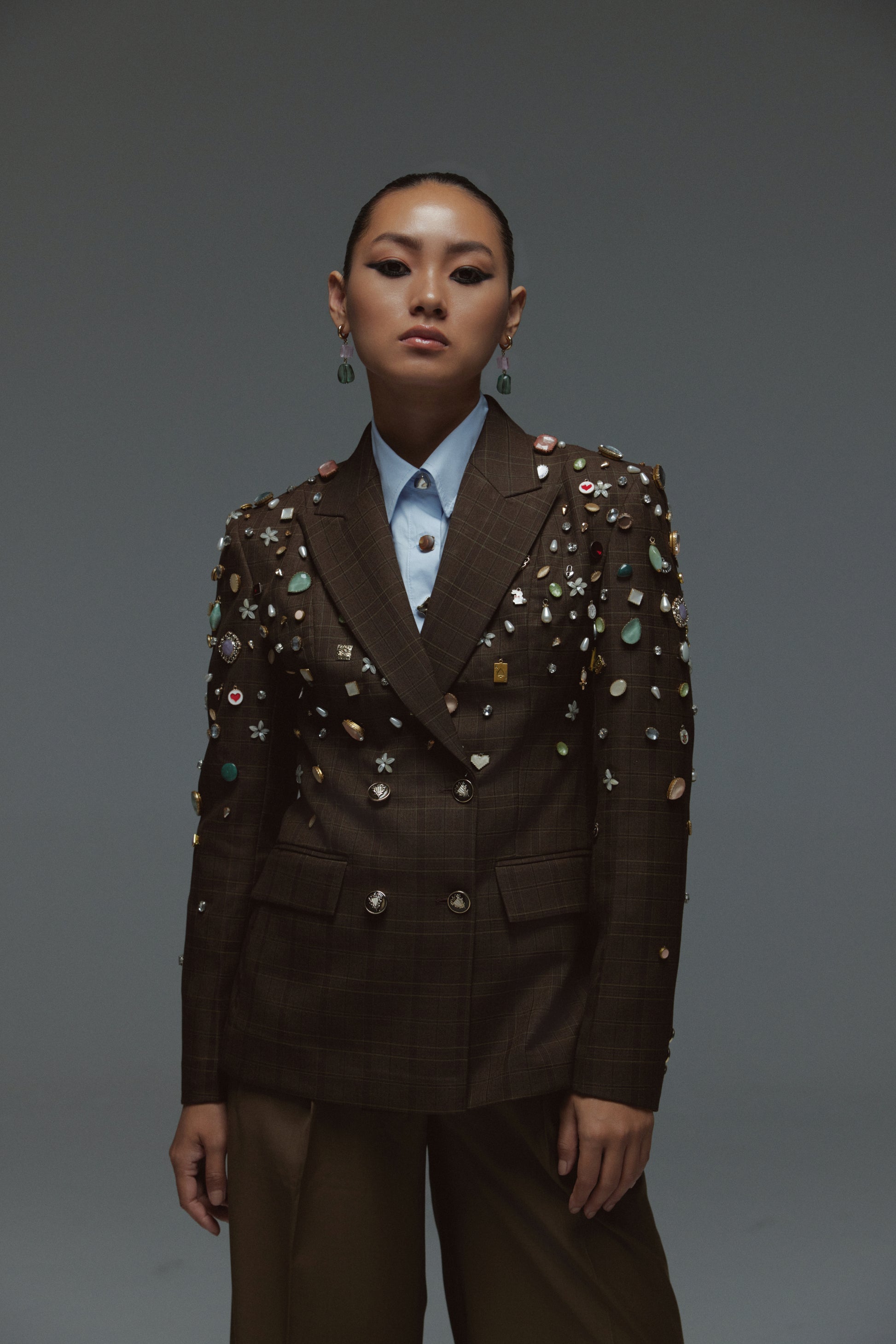 A bold reimagining of classic tailoring the Night at the Cinema set merges structured elegance with avant-garde embellishment. It includes a sharply tailored, double-breasted coat crafted from luxurious Cavani wool-blend plaid, featuring peak lapels, structured shoulders along with a complementing tailored fit and flare trousers ensuring both comfort and power dressing in one.