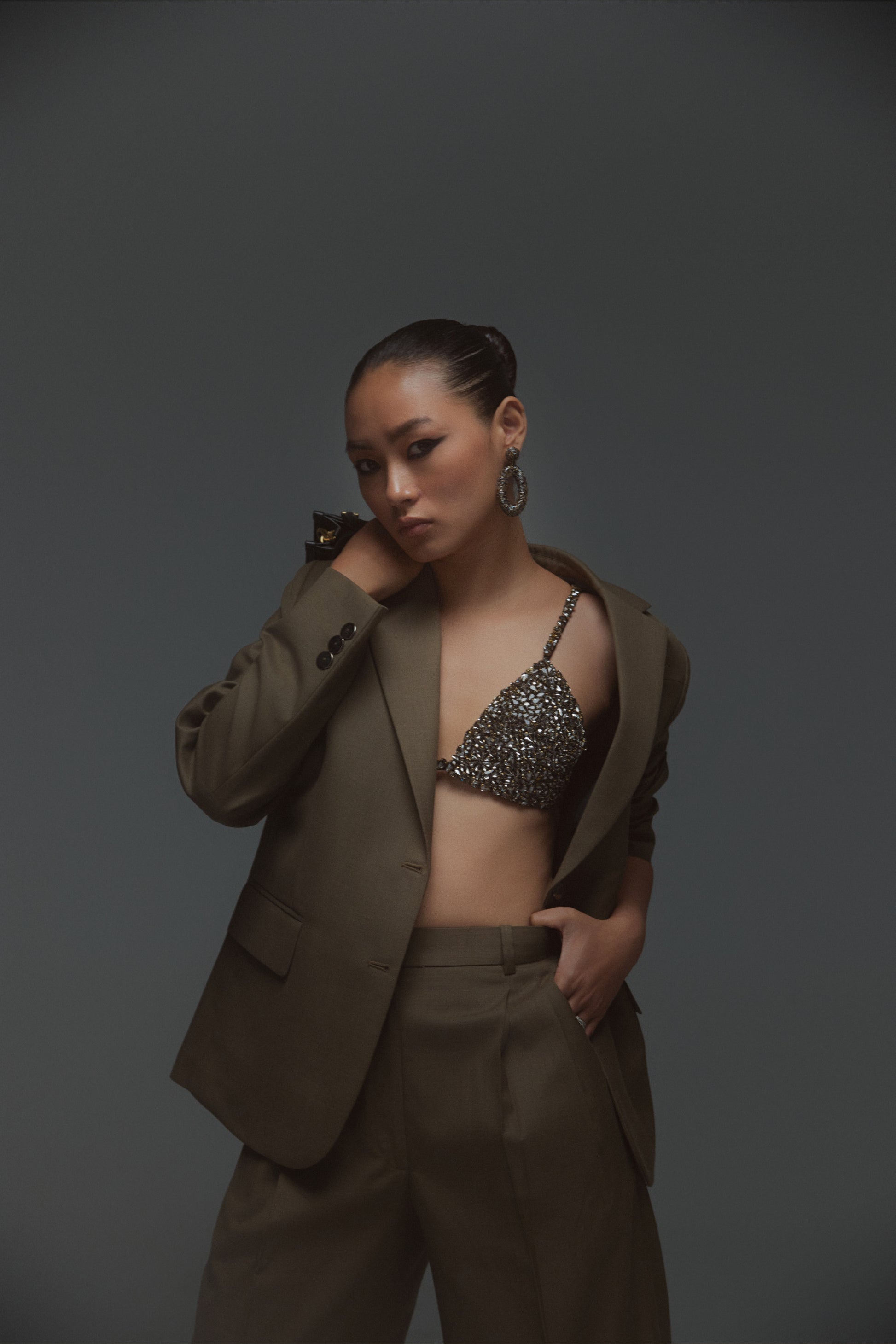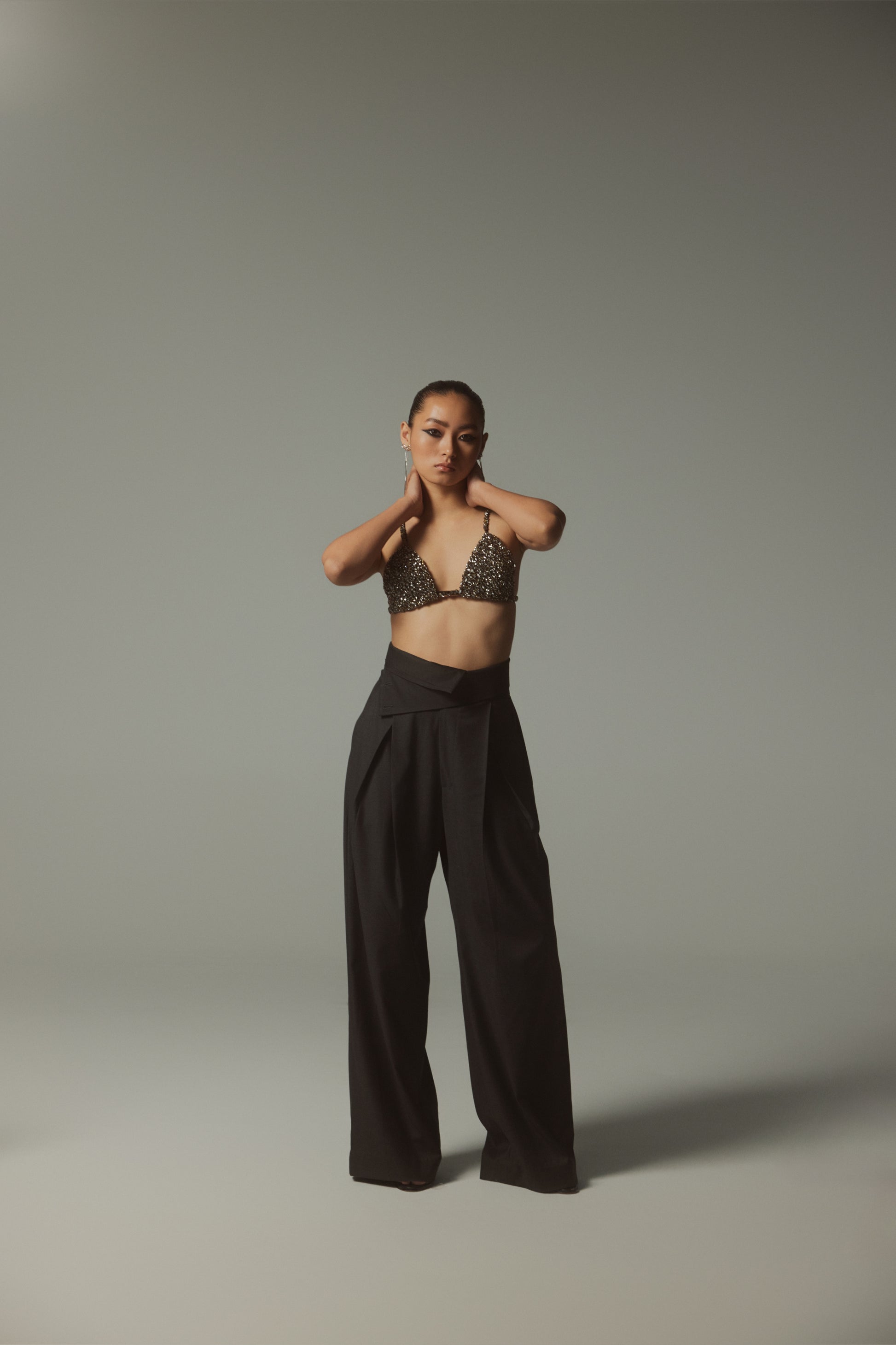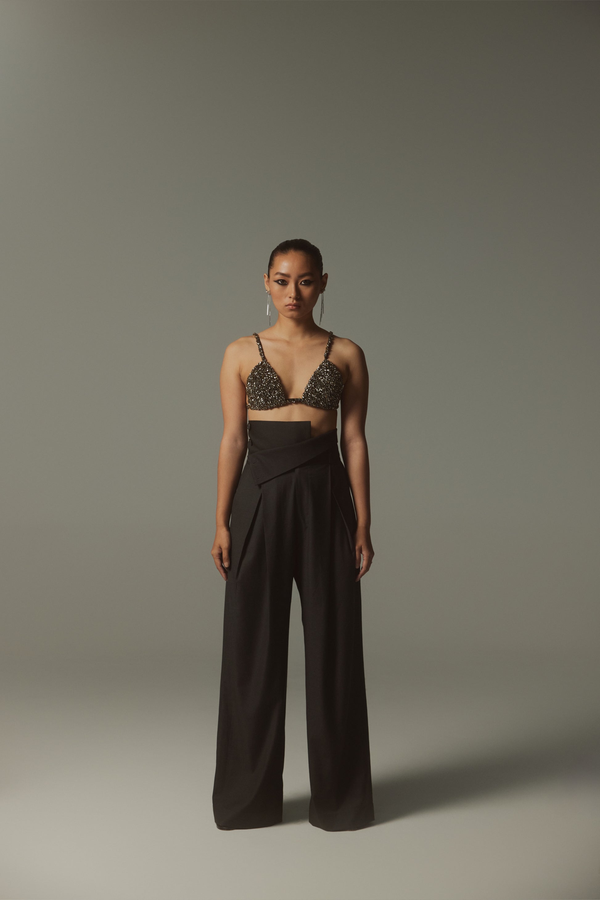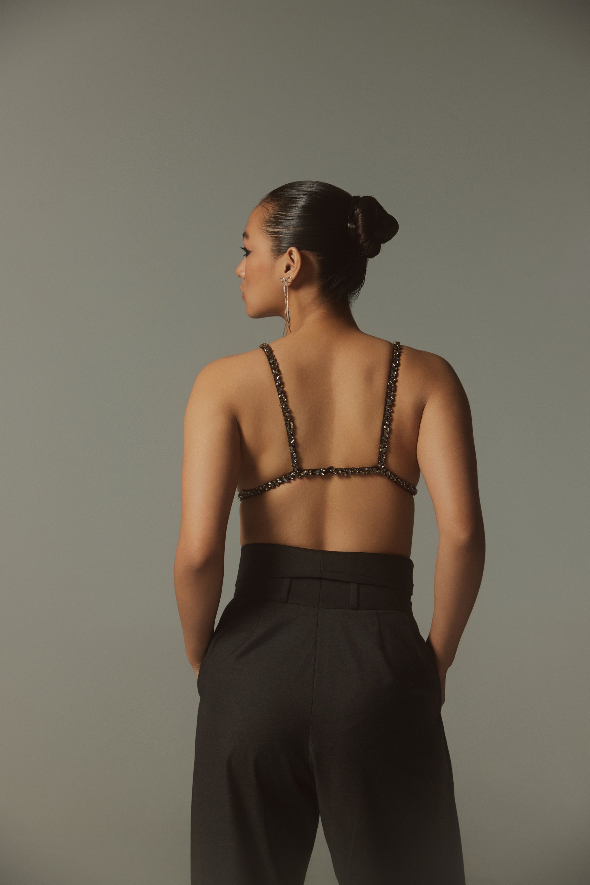 A striking fusion of opulence and modern edge, The Celeste Bralette is a statement piece designed for bold, confident dressing. Hand-embellished with meticulously placed crystals, it catches the light from every angle, ensuring a dazzling effect. Pair it with the Miko Trouser for an edgy evening look or a sharp blazer for power dressing with a twist.