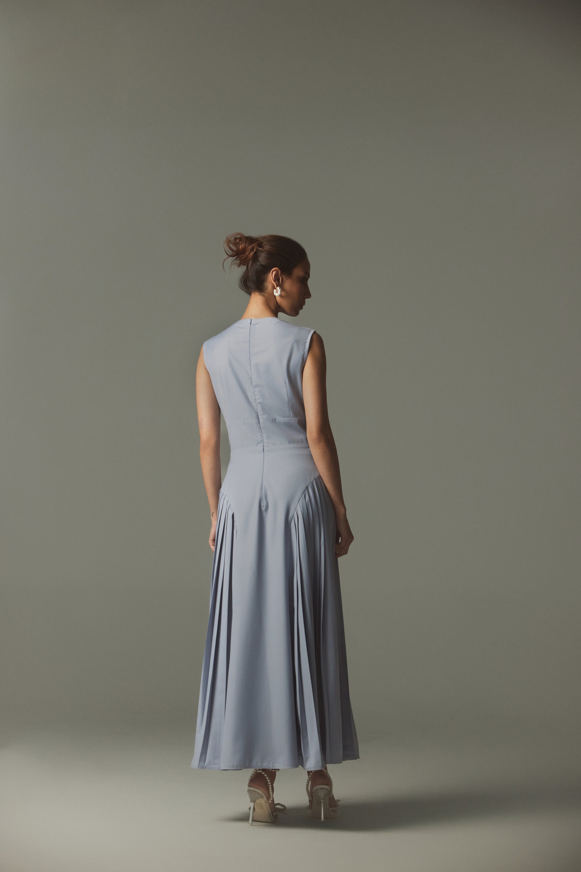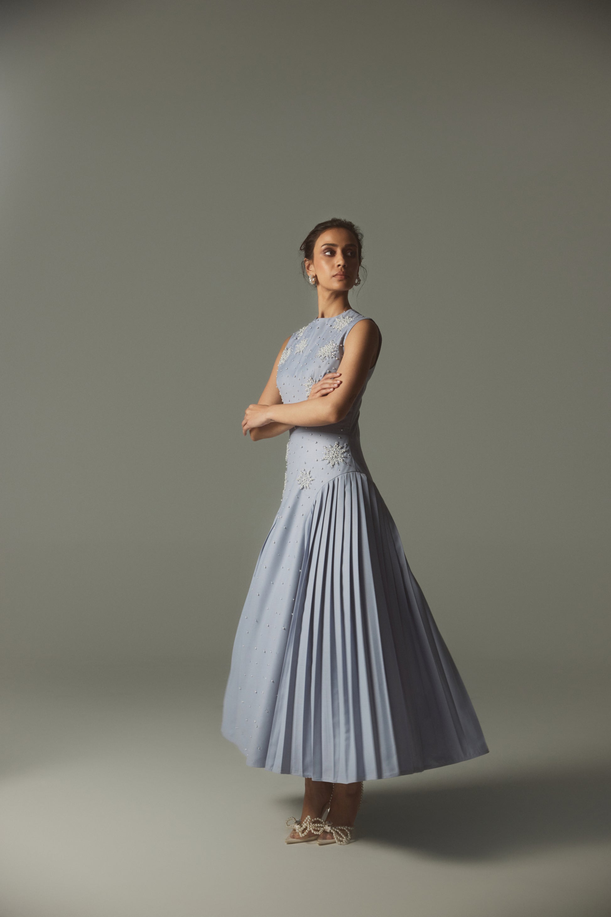 The Amber Dress is a timeless statement of sophistication. Designed to move fluidly while maintaining a structured, flattering silhouette, the dress features a sleeveless, high-neck bodice adorned with hand-embellished pearl and crystal detailing in delicate floral motifs, adding a touch of ethereal charm. A refined balance between modern femininity and vintage allure, The Amber Dress is designed for those who appreciate artistry in fashion.