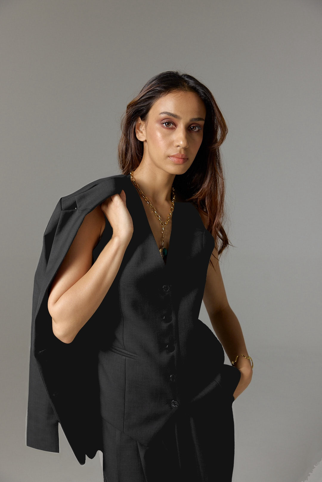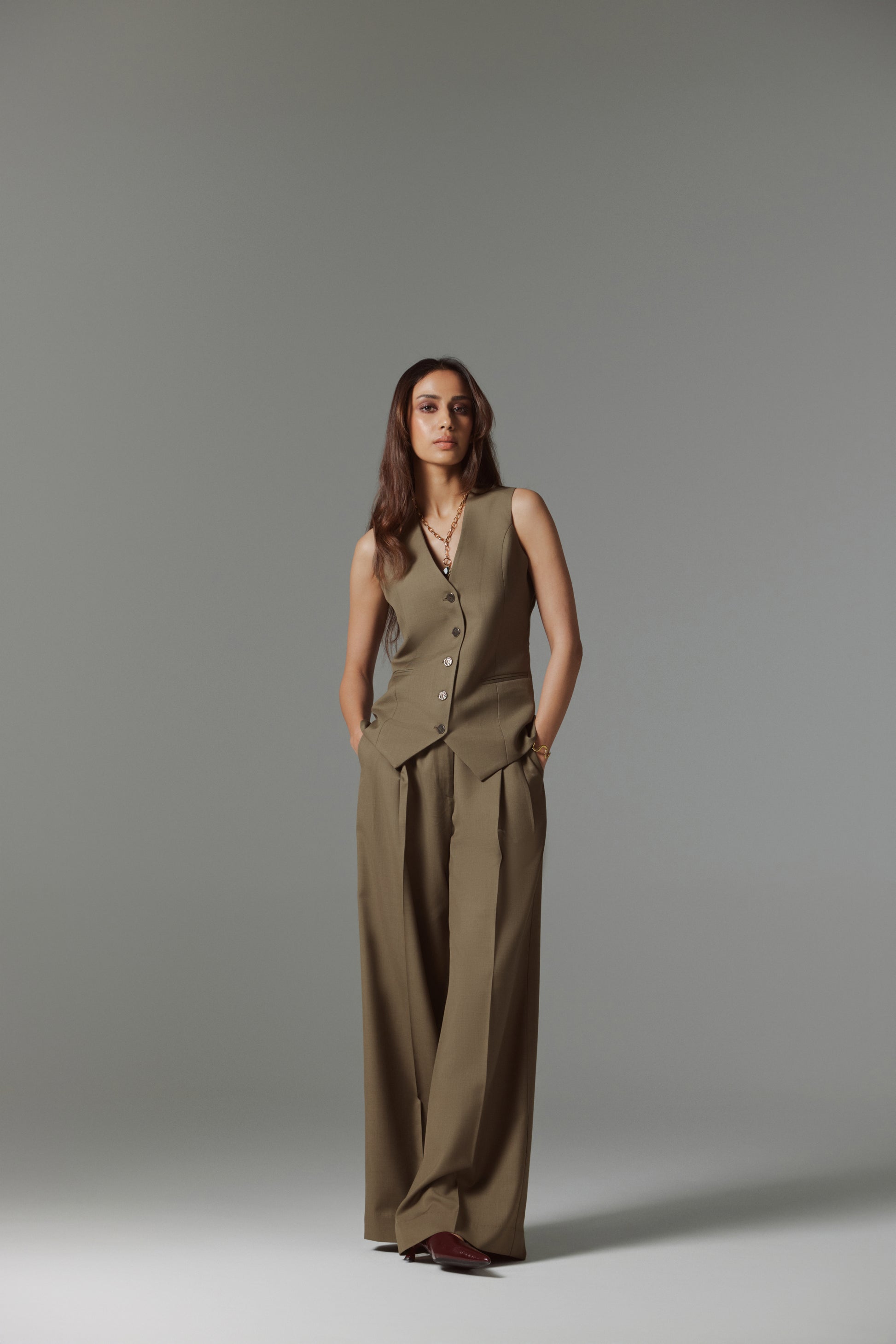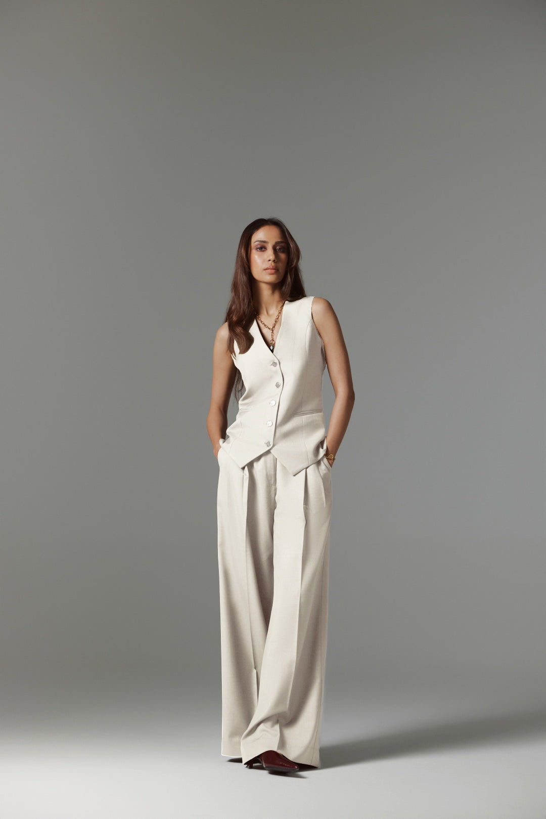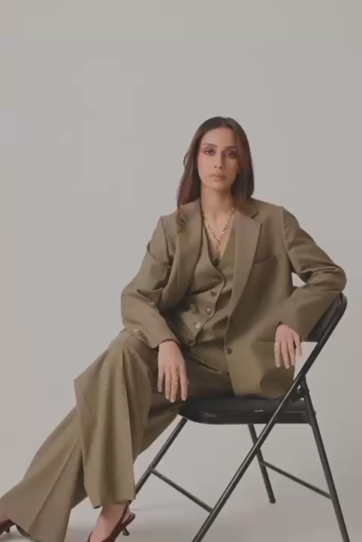 A contemporary take on power dressing, the Gaia Suit embodies confidence and effortless sophistication. The set includes a sharply tailored single-breasted blazer with structured shoulders, and a buttoned waistcoat with a deep V-neck, adding a refined, waist-defining element to the look. Wide-legged and high-waisted, trousers are offered along with.