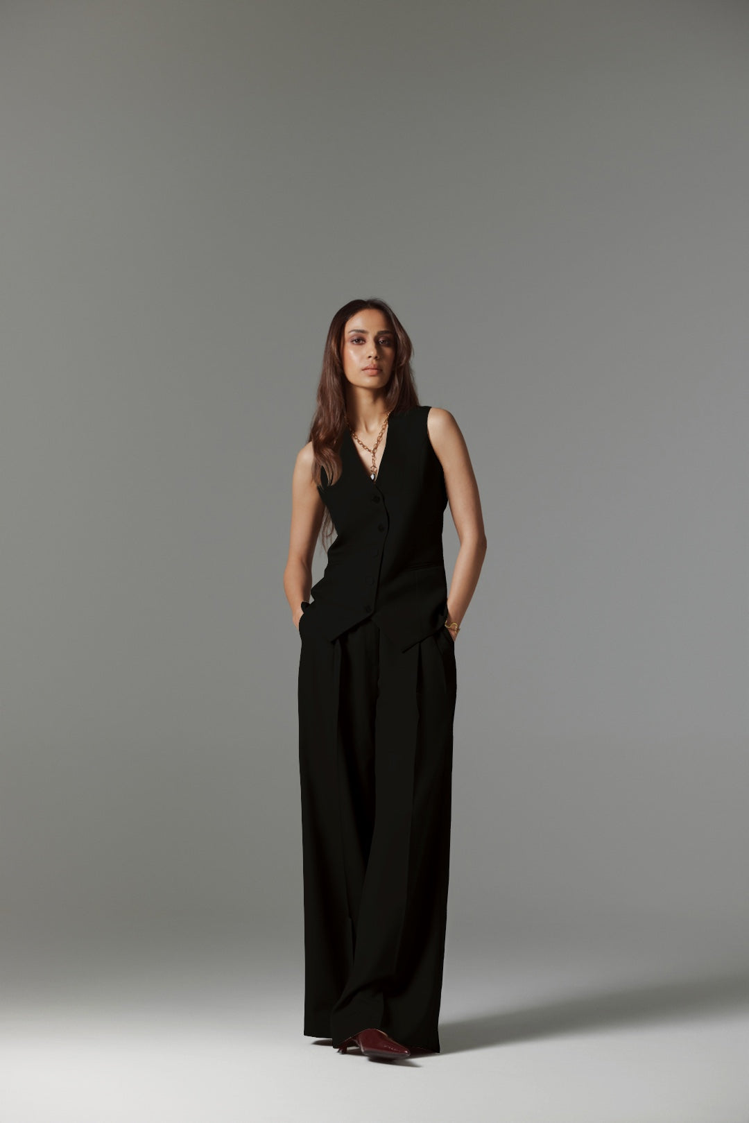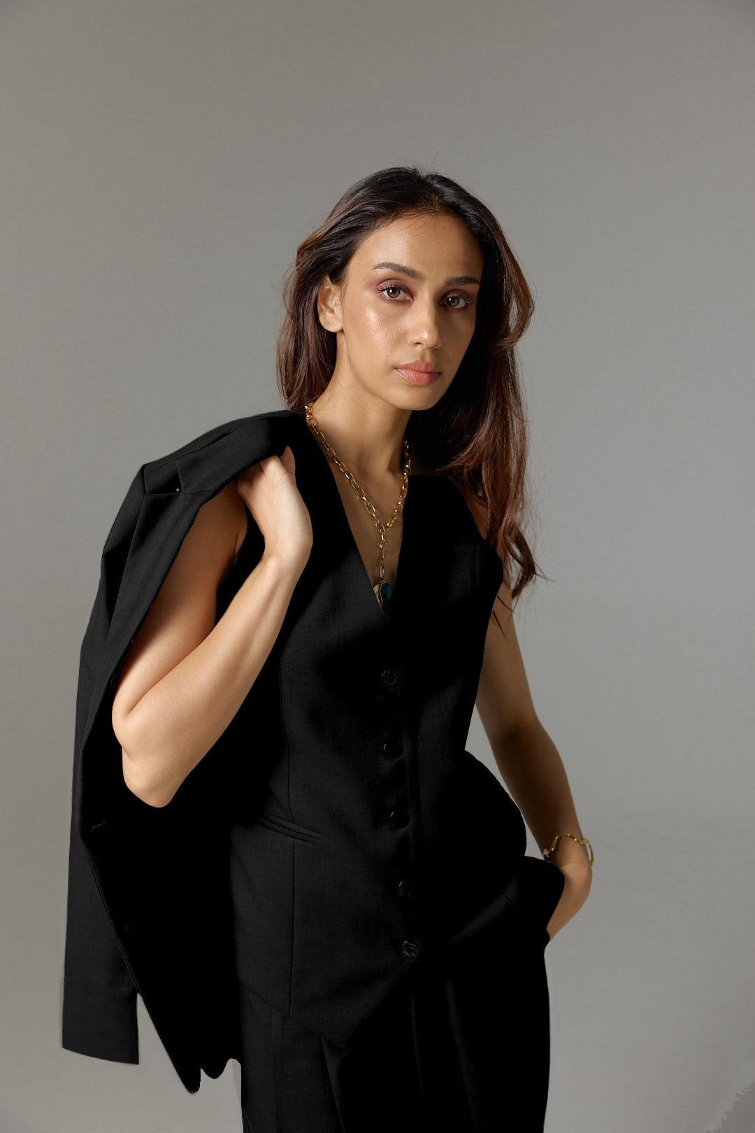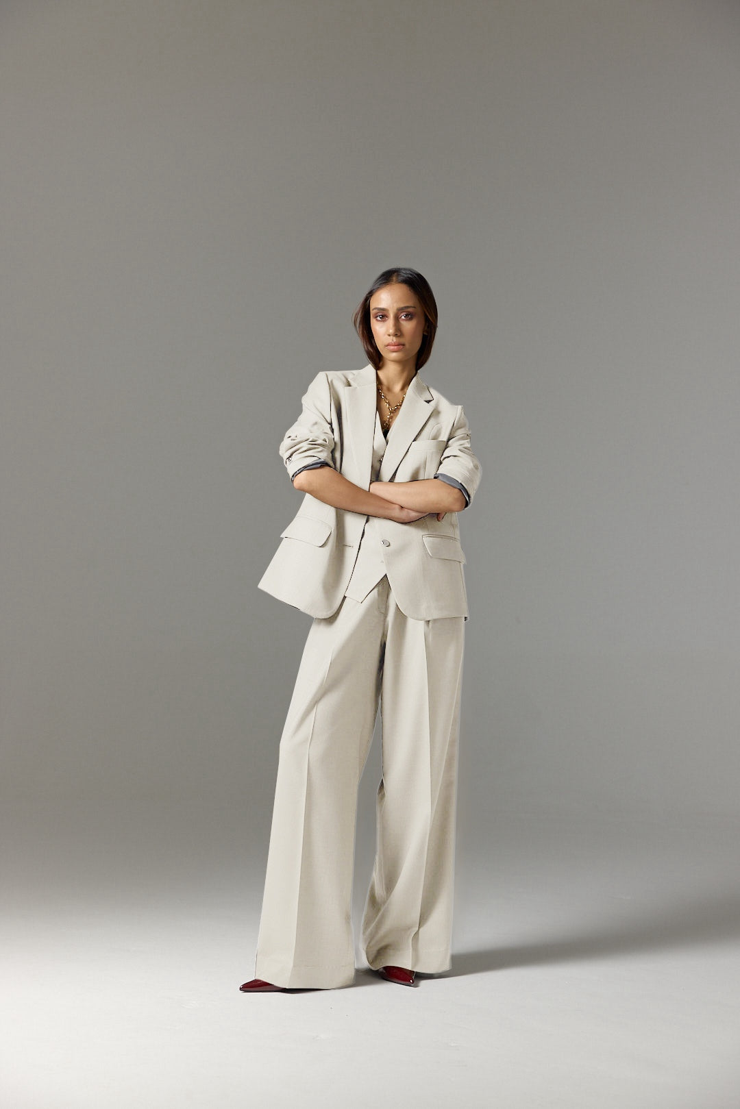 A contemporary take on power dressing, the Gaia Suit embodies confidence and effortless sophistication. The set includes a sharply tailored single-breasted blazer with structured shoulders, and a buttoned waistcoat with a deep V-neck, adding a refined, waist-defining element to the look. Wide-legged and high-waisted, trousers are offered along with.