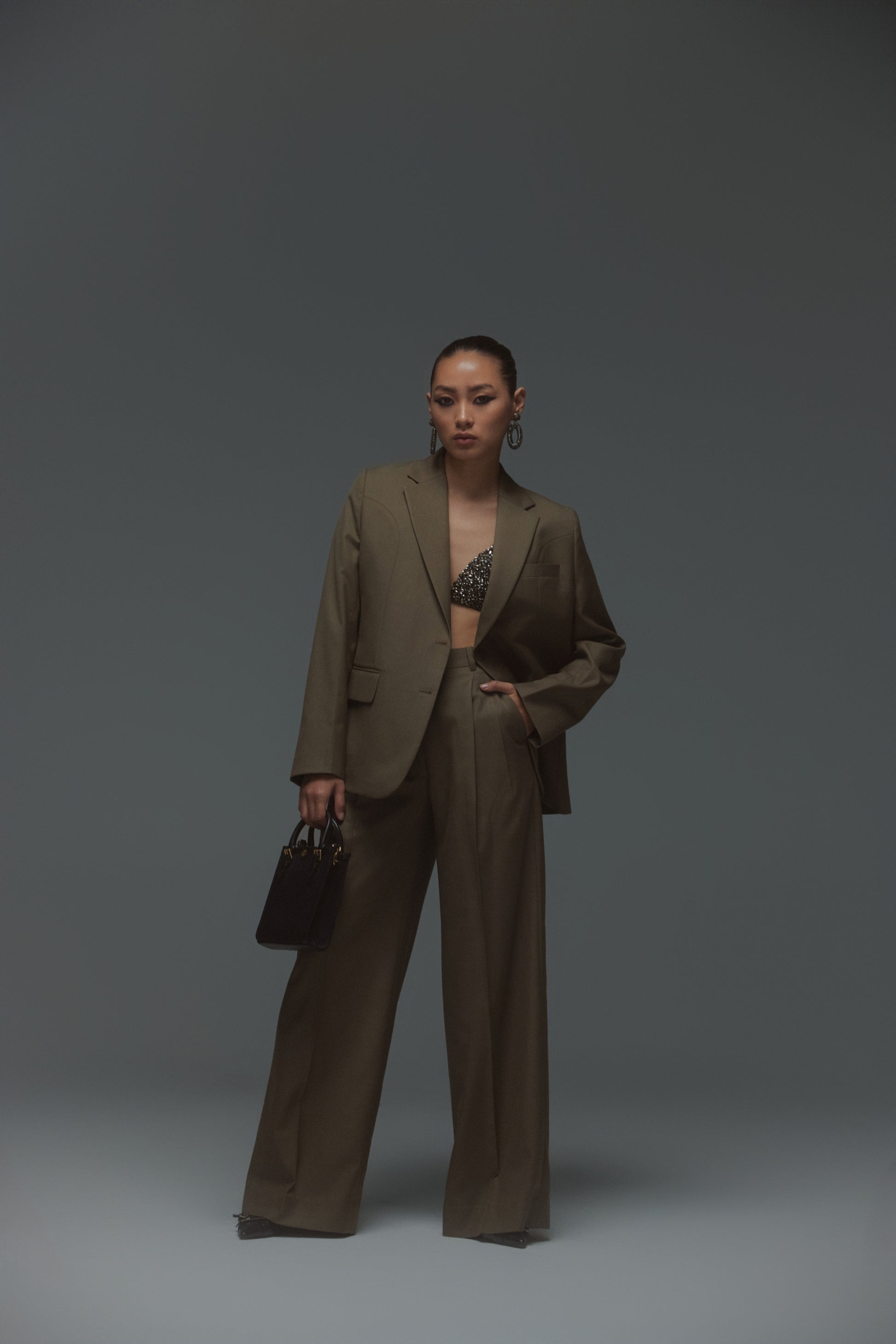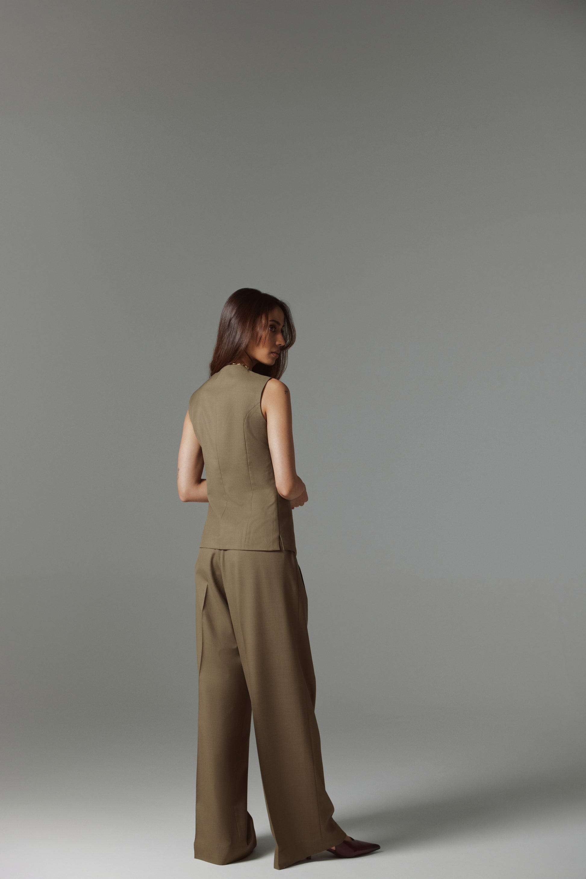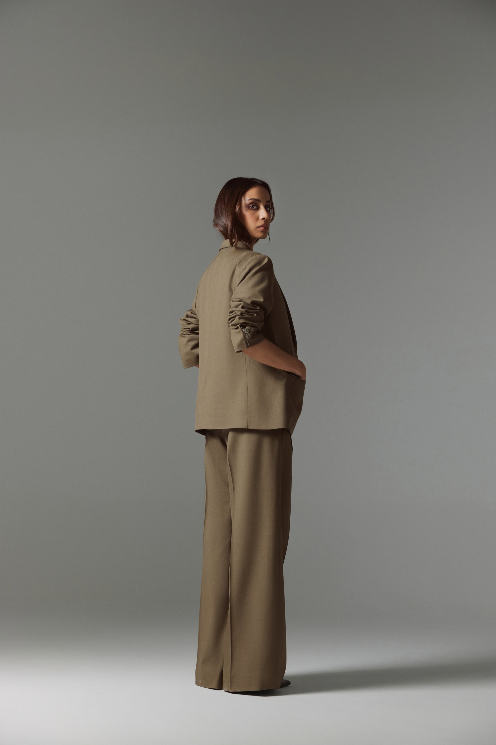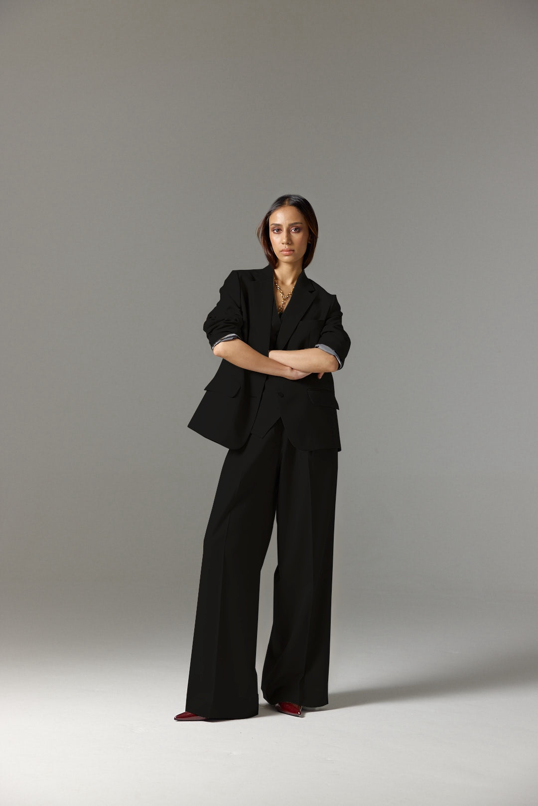 A contemporary take on power dressing, the Gaia Suit embodies confidence and effortless sophistication. The set includes a sharply tailored single-breasted blazer with structured shoulders, and a buttoned waistcoat with a deep V-neck, adding a refined, waist-defining element to the look. Wide-legged and high-waisted, trousers are offered along with.