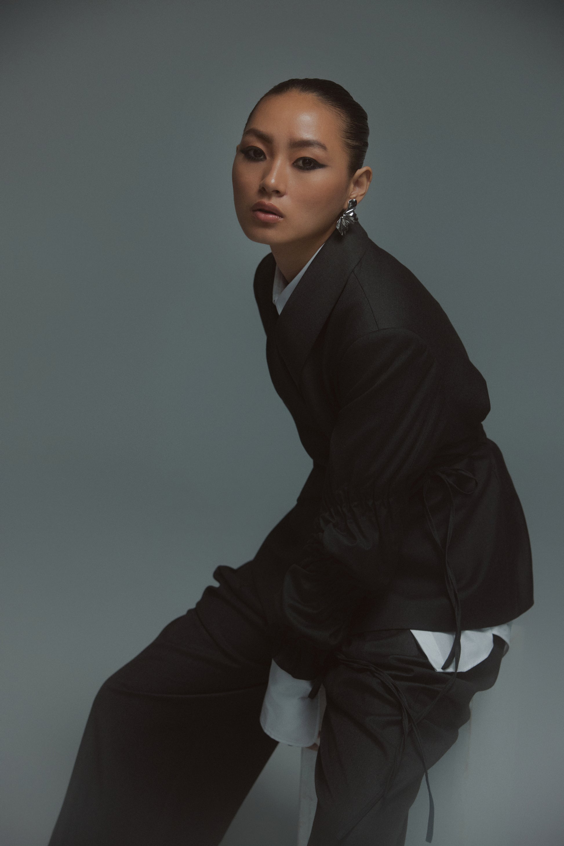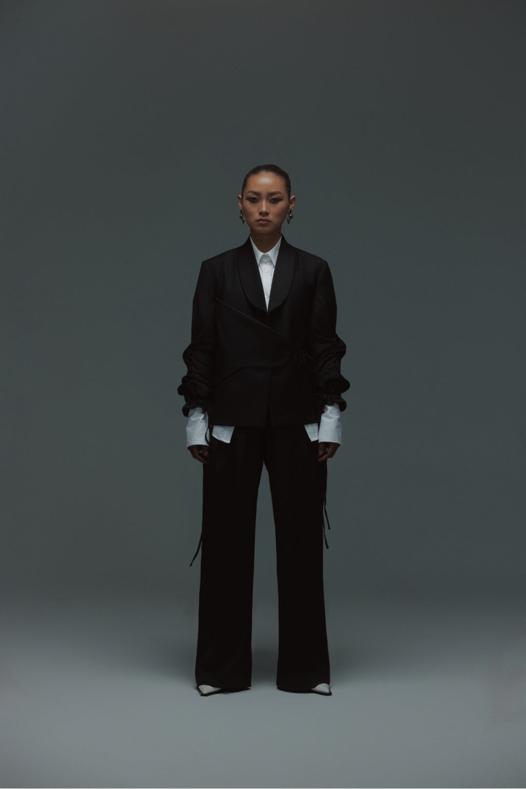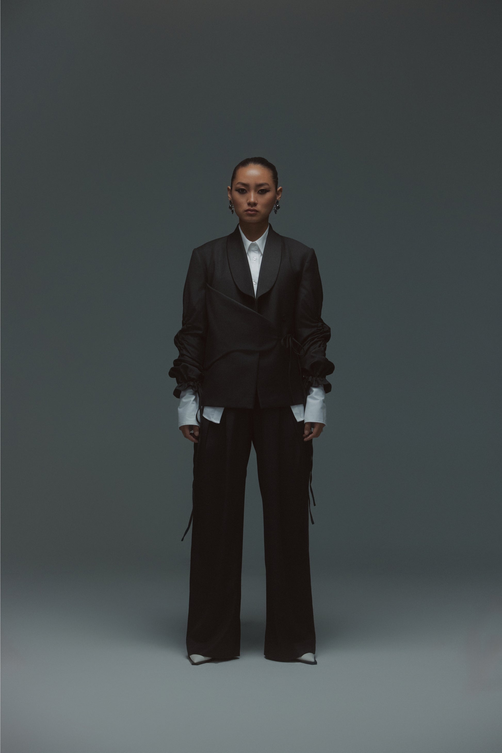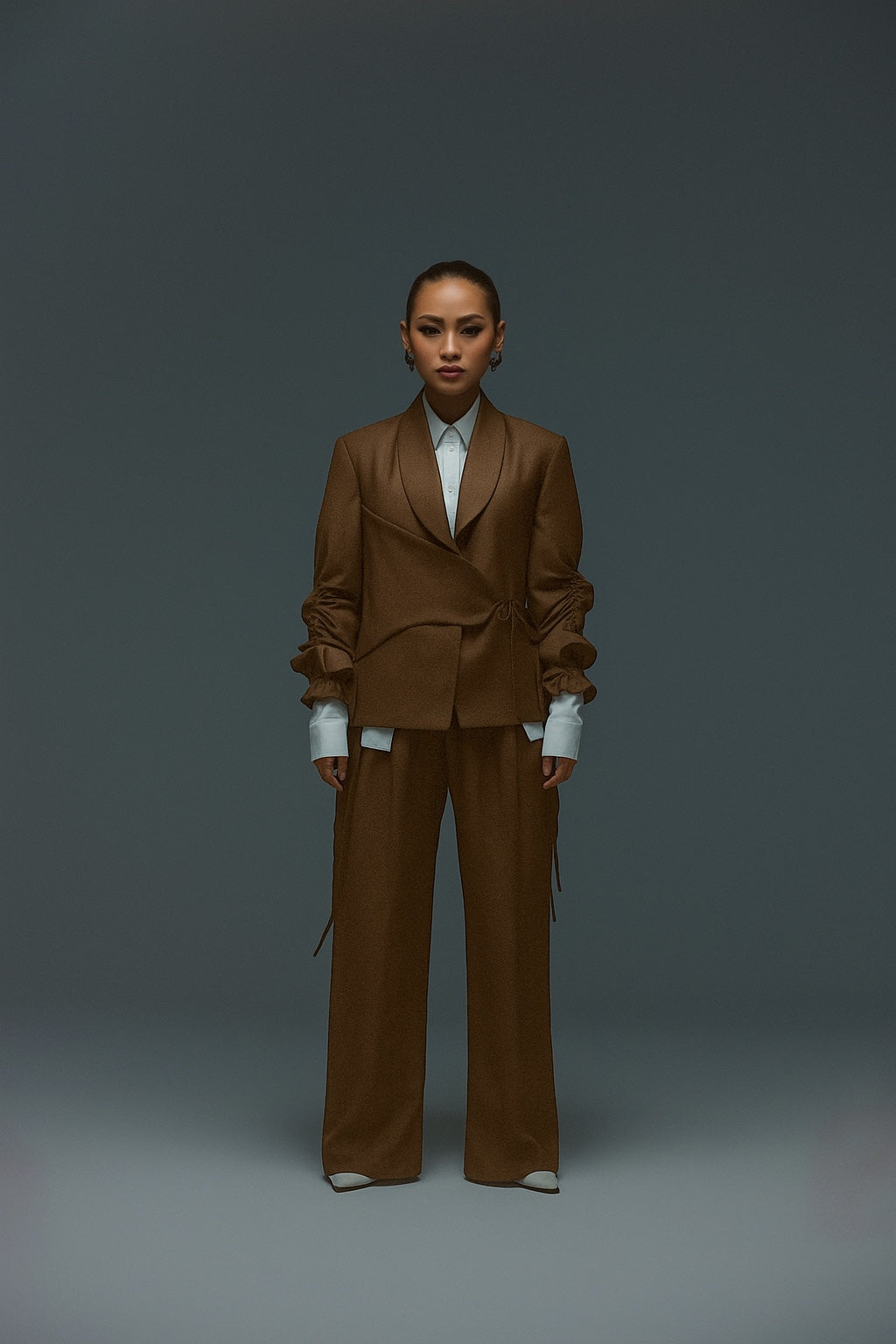 Designed for effortless sophistication, this two-piece set features a sculpted jacket with a soft wrap detail and drawstring-gathered sleeves, paired with fluid wide-leg trousers for a relaxed yet structured silhouette. Designed for versatility, the set moves seamlessly from formal gatherings to elevated daywear. Thoughtful details like subtle ties and clean tailoring offer a modern balance of polish and ease, making it an essential piece for a contemporary wardrobe.