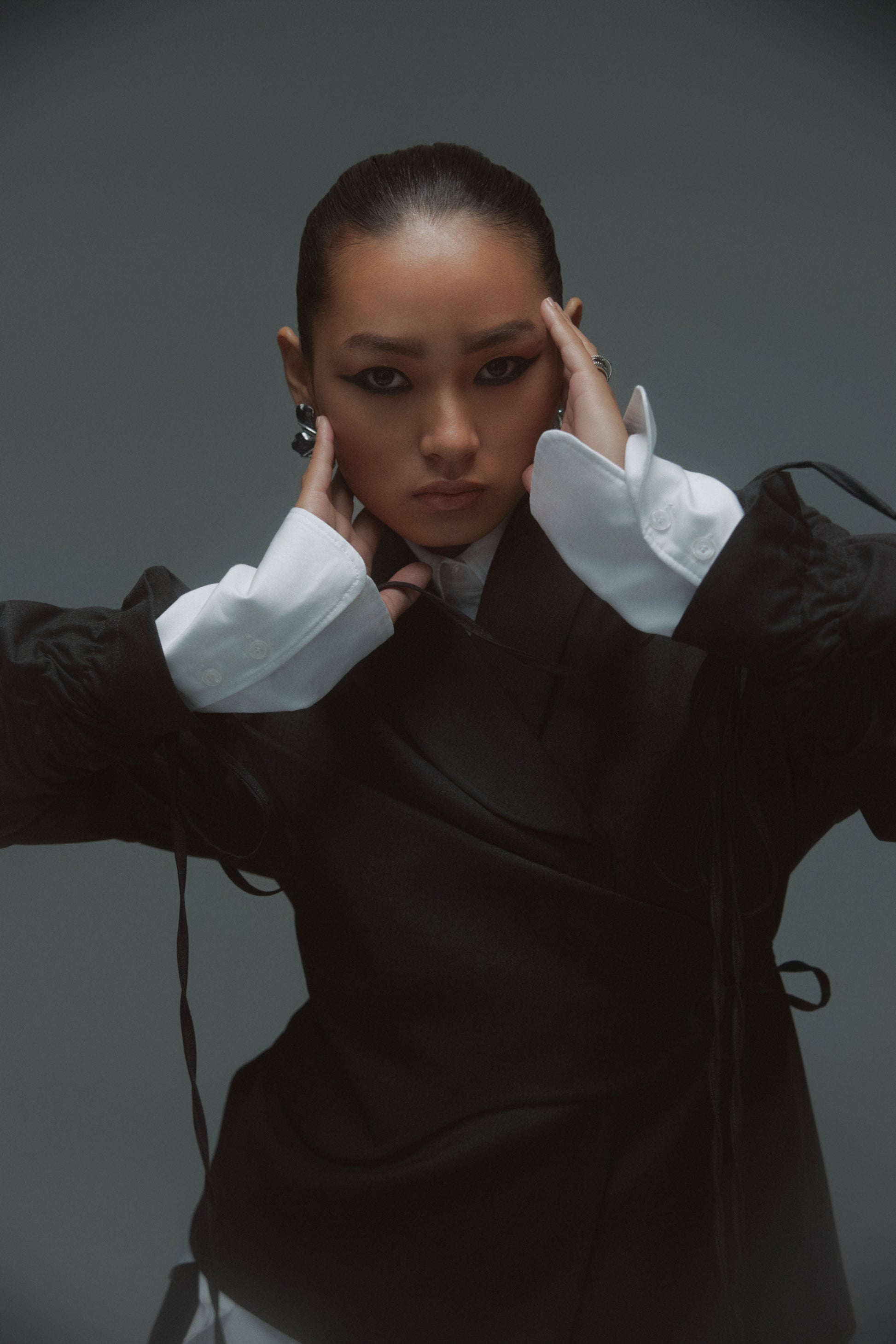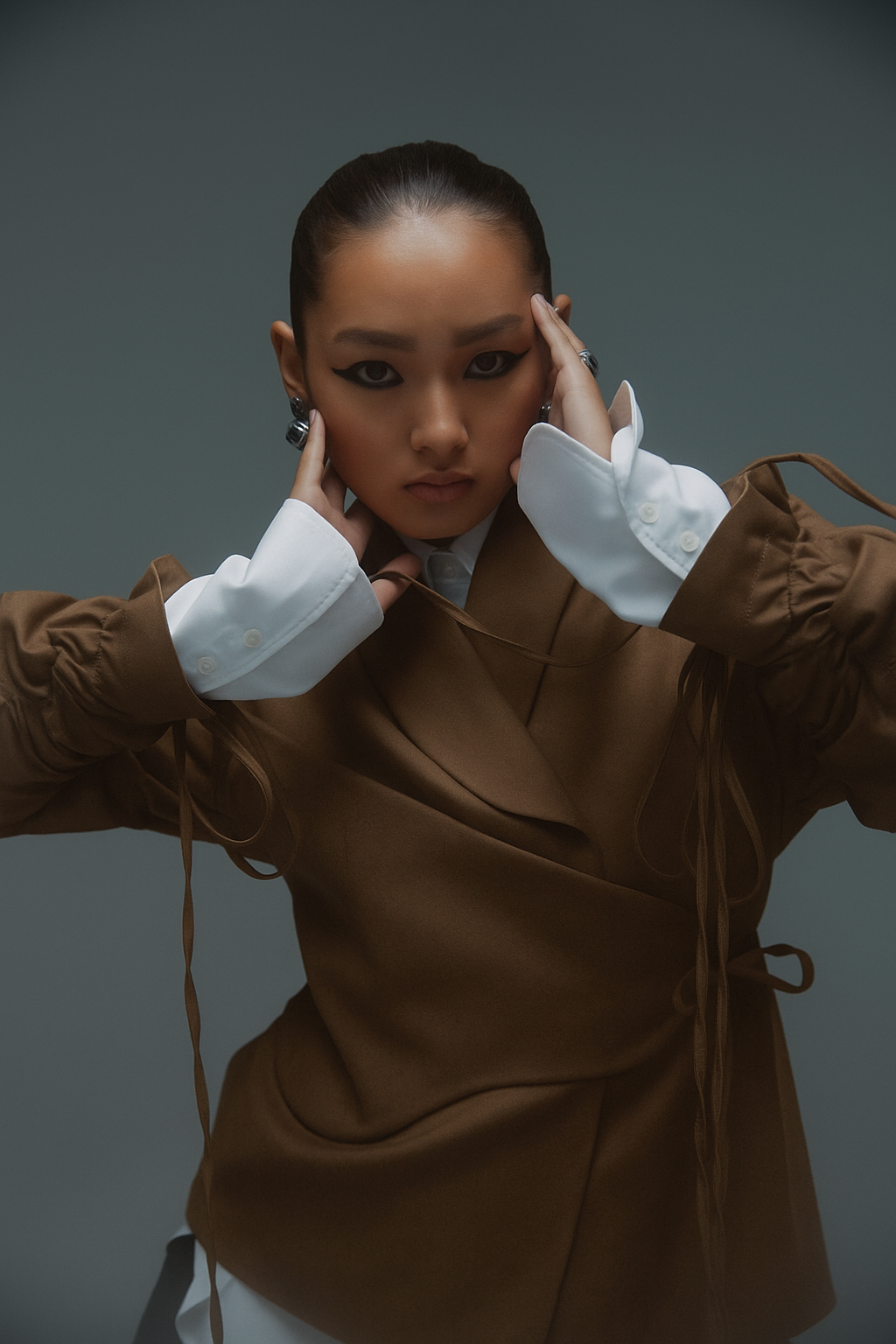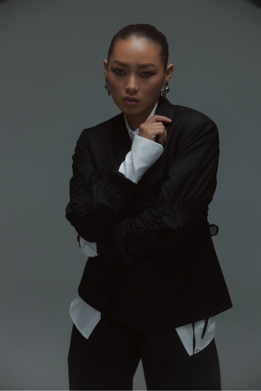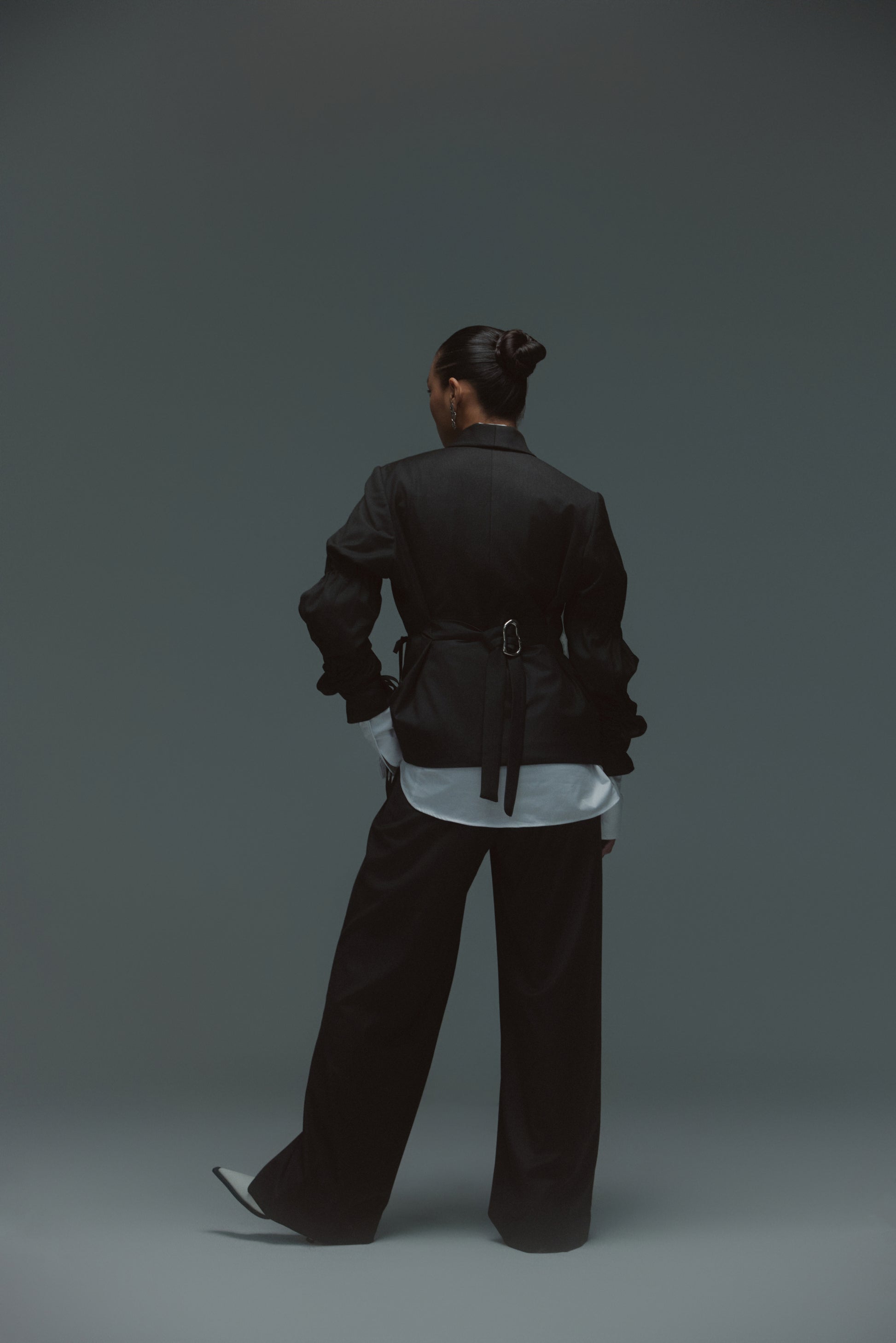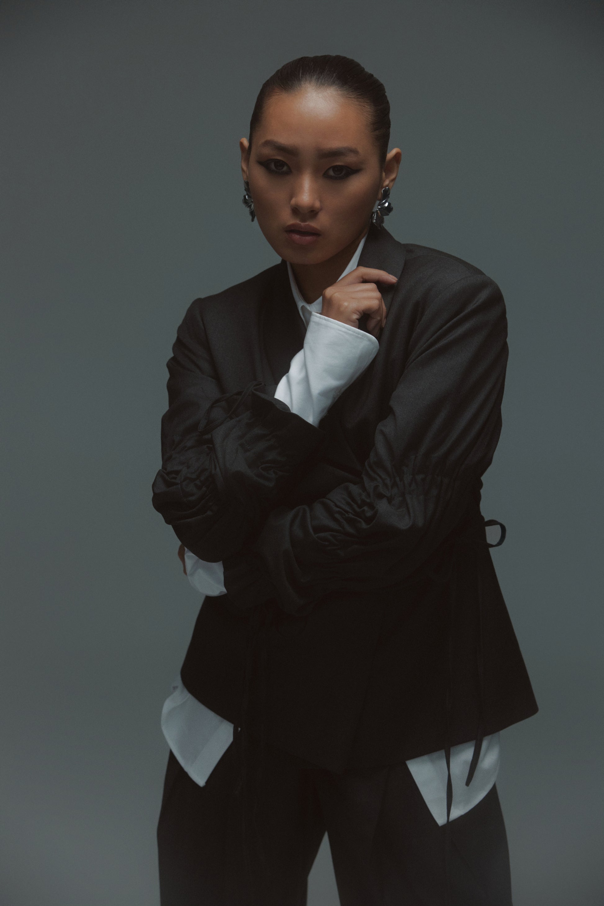 Designed for effortless sophistication, this two-piece set features a sculpted jacket with a soft wrap detail and drawstring-gathered sleeves, paired with fluid wide-leg trousers for a relaxed yet structured silhouette. Designed for versatility, the set moves seamlessly from formal gatherings to elevated daywear. Thoughtful details like subtle ties and clean tailoring offer a modern balance of polish and ease, making it an essential piece for a contemporary wardrobe.
