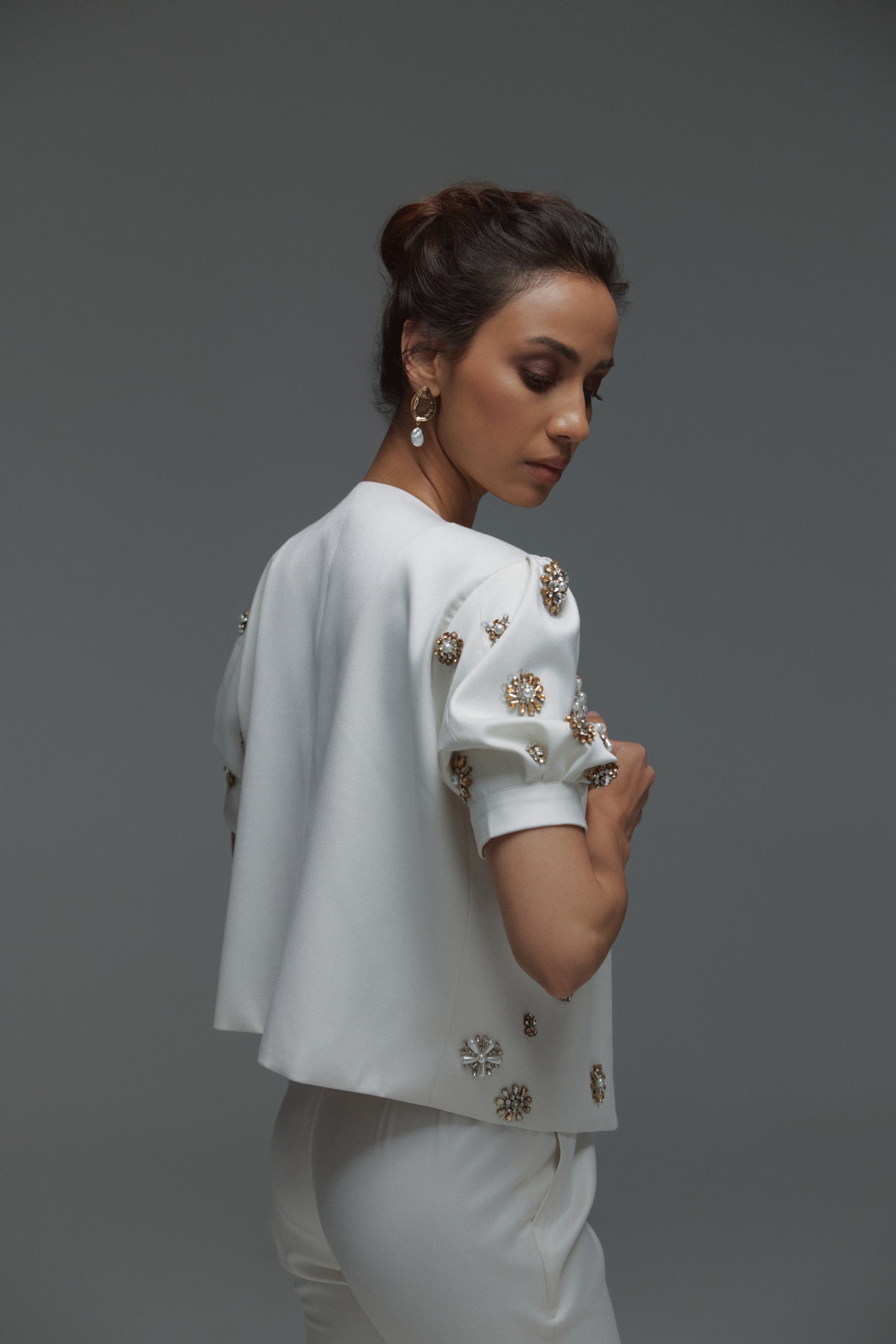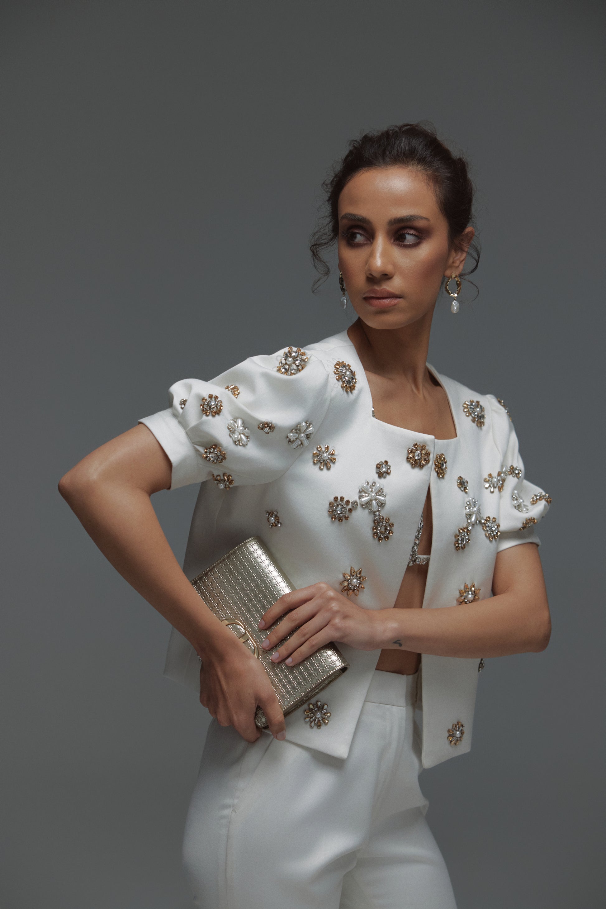 A striking blend of refined tailoring and intricate embellishment, the Monet Set is a true statement ensemble designed for the sophisticated woman. Crafted from luxurious Georgia Gullini 120’s Australian Wool, this set redefines power dressing with a touch of opulence. A cropped, open-front blazer with voluminous short sleeves and exquisite hand-embellished detailing, adding a regal and artistic touch. It comes with a high-waisted, impeccably tailored trousers with slight flare at the bottom. Perfect for high-fashion soirées, gala events, or an elevated evening look, the Monet Set is a masterpiece of modern luxury.