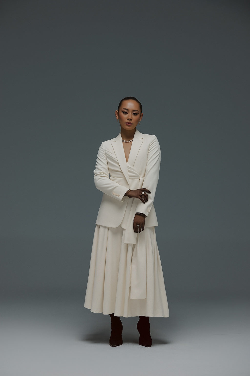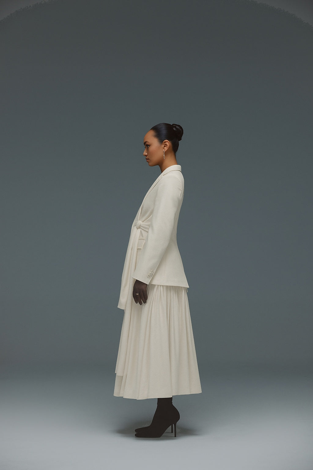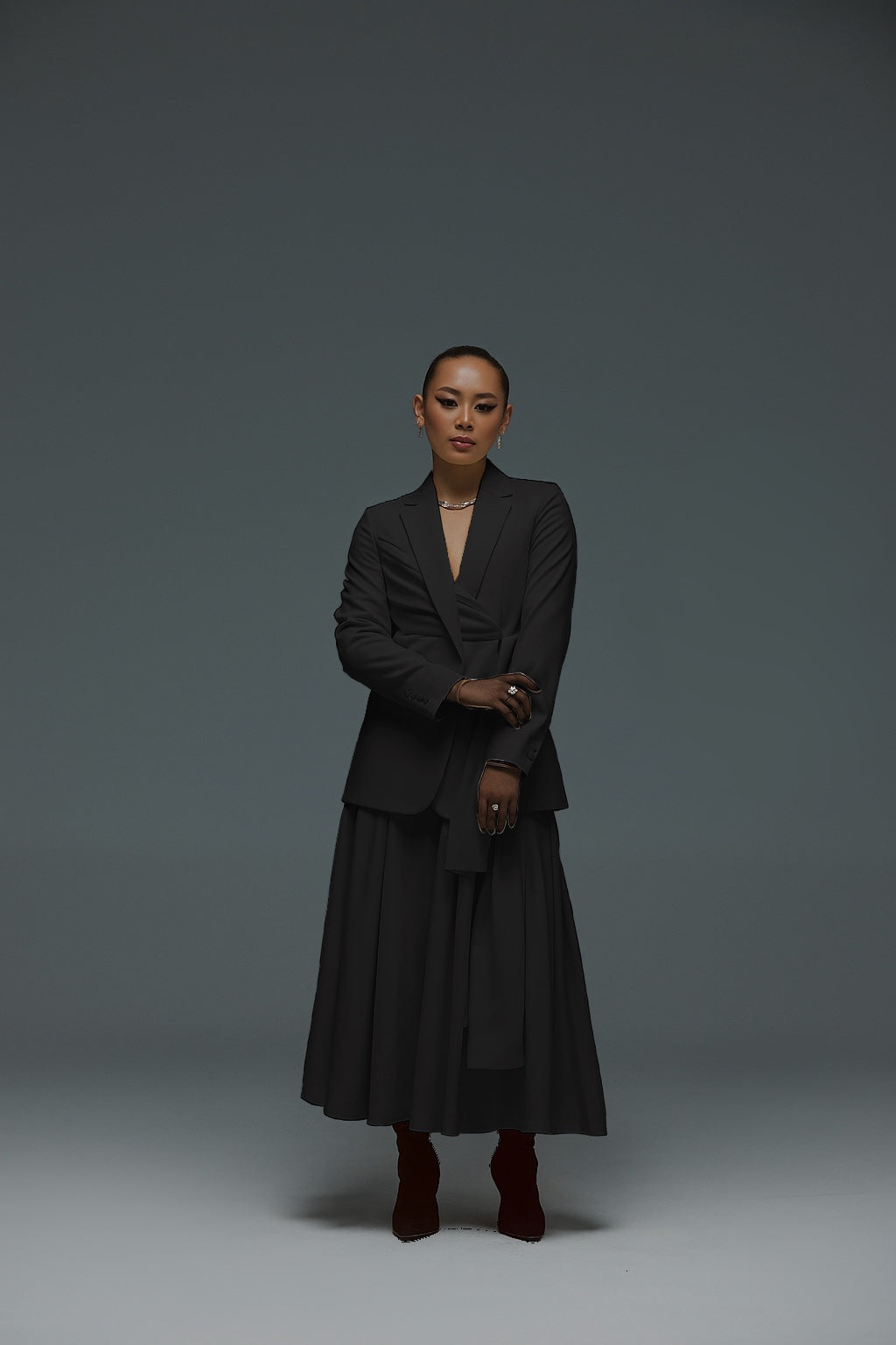 A bold expression of power and grace, The Raya set is an effortless blend of masculine sharpness and feminine fluidity. The set offers a structured, tailored jacket with a sleek lapel, satin drape and sharp shoulders along with A flowing, pleated midi skirt that contrasts the blazer’s structured appeal, creating an effortlessly balanced look.