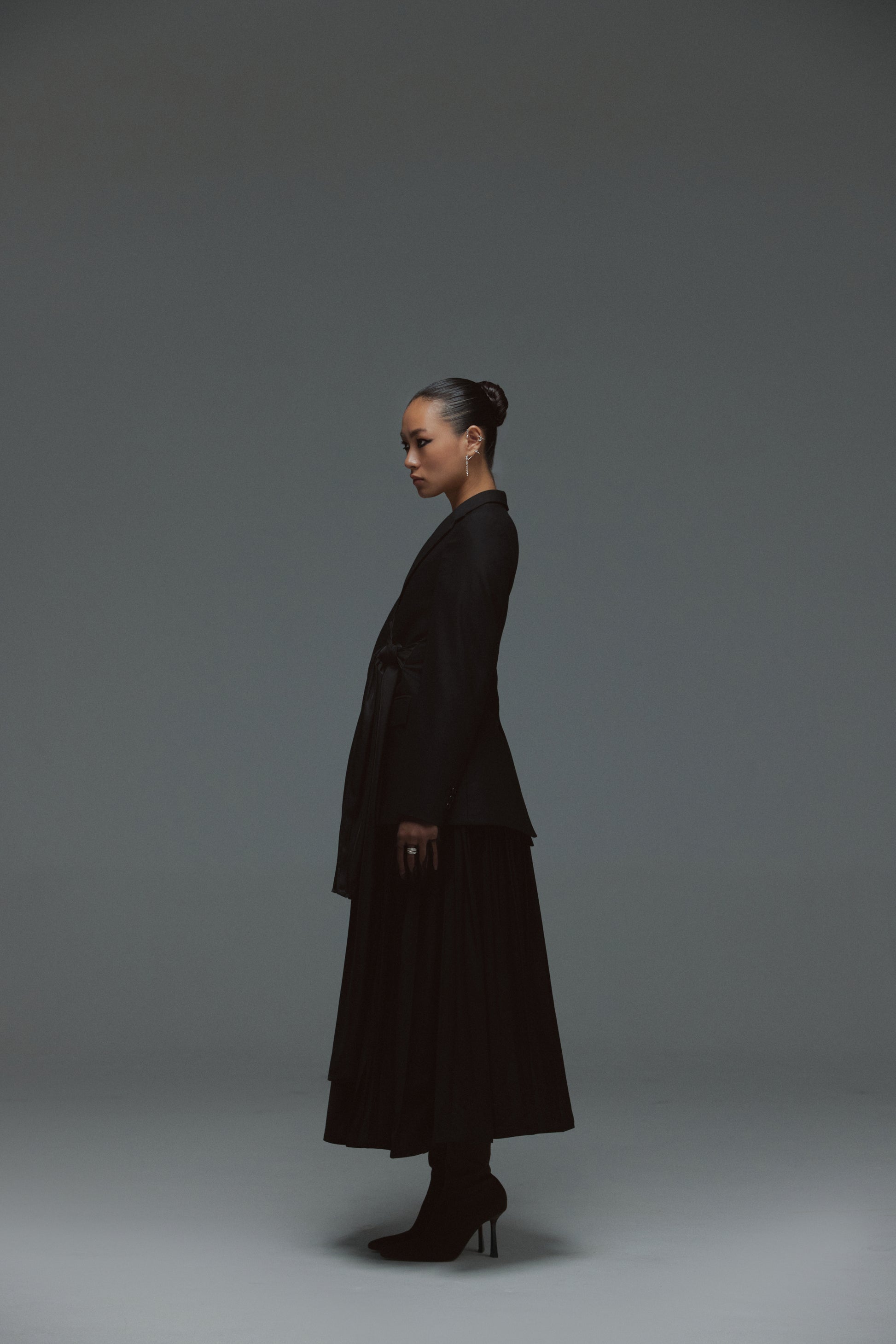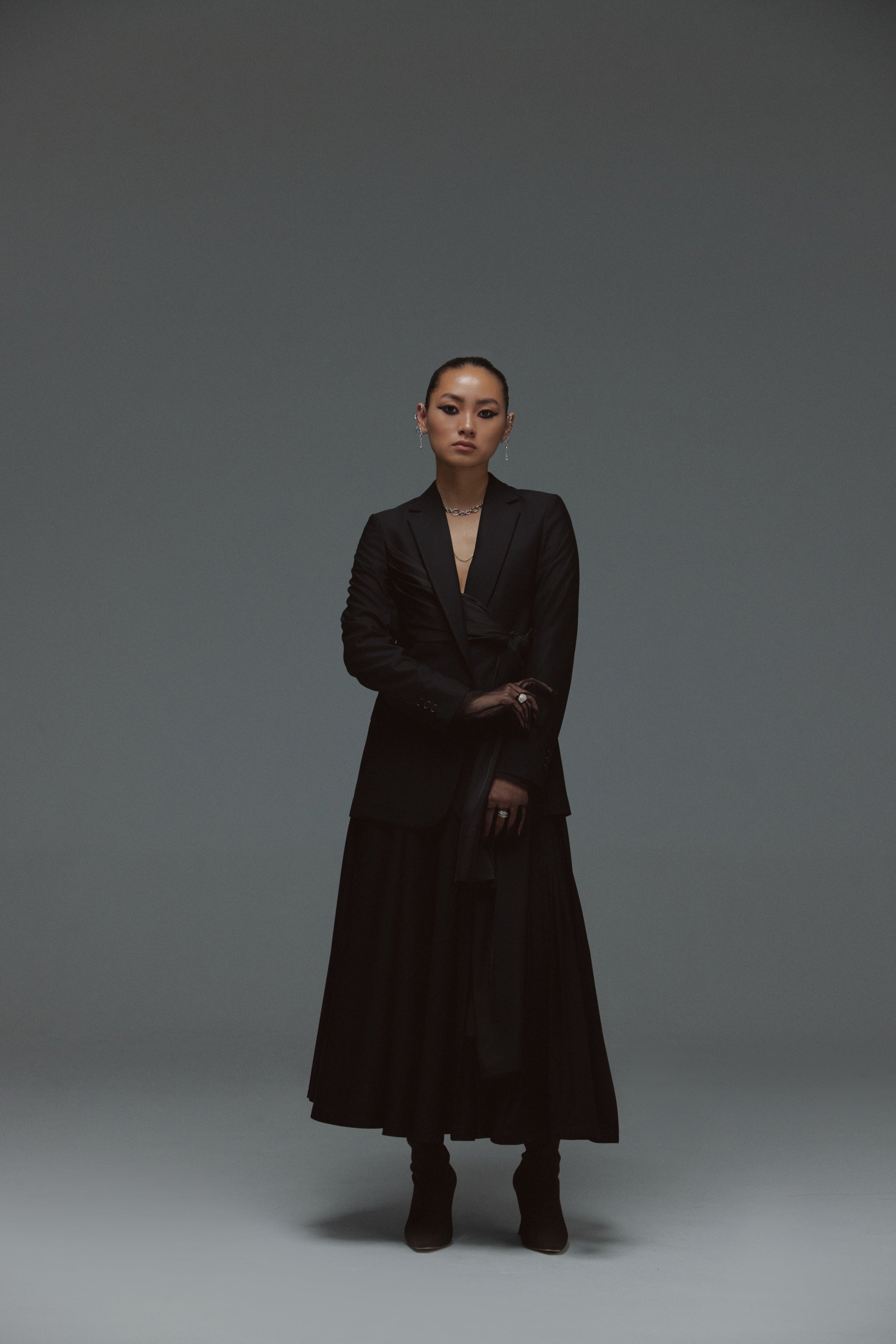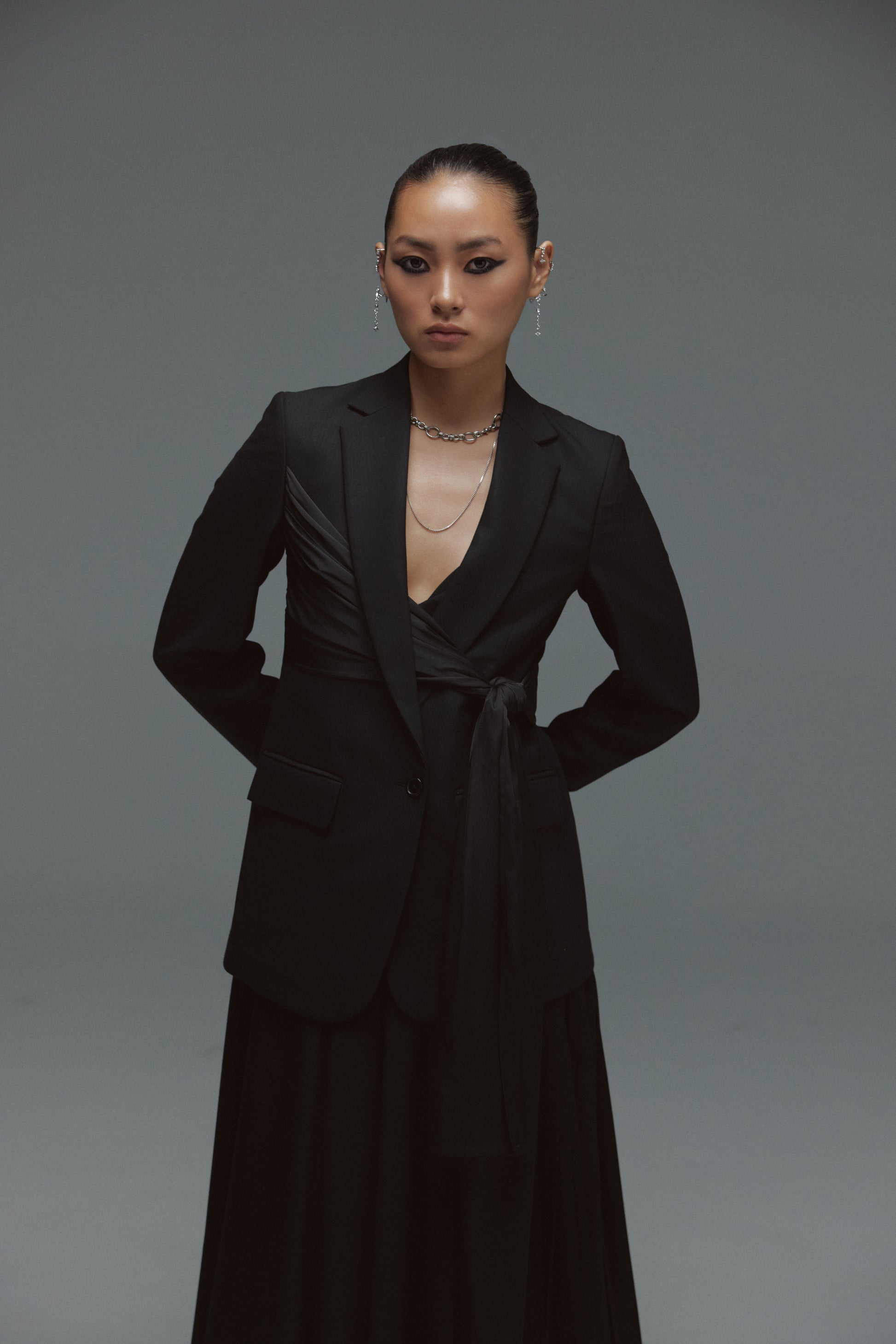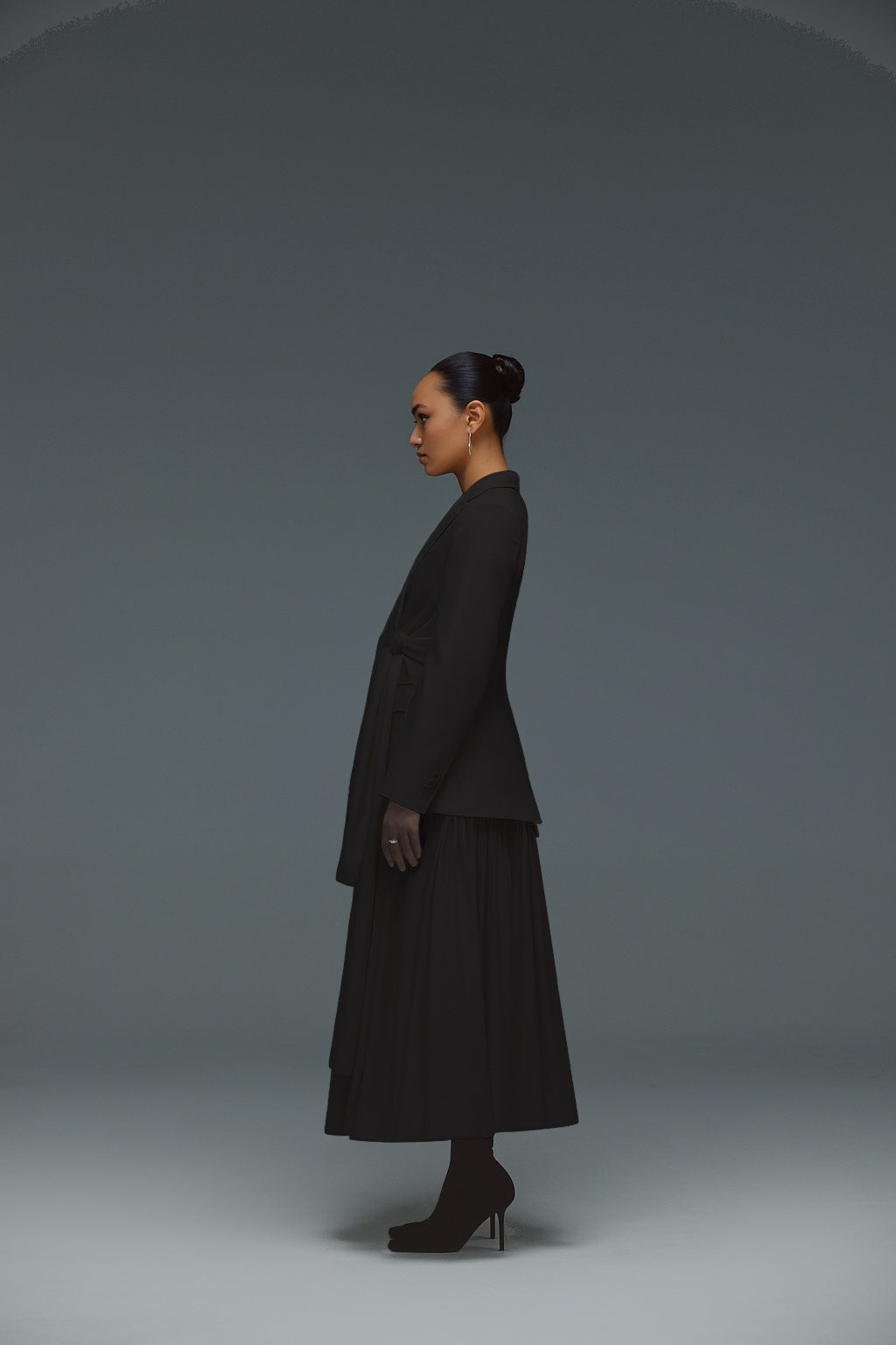 A bold expression of power and grace, The Raya set is an effortless blend of masculine sharpness and feminine fluidity. The set offers a structured, tailored jacket with a sleek lapel, satin drape and sharp shoulders along with A flowing, pleated midi skirt that contrasts the blazer’s structured appeal, creating an effortlessly balanced look.